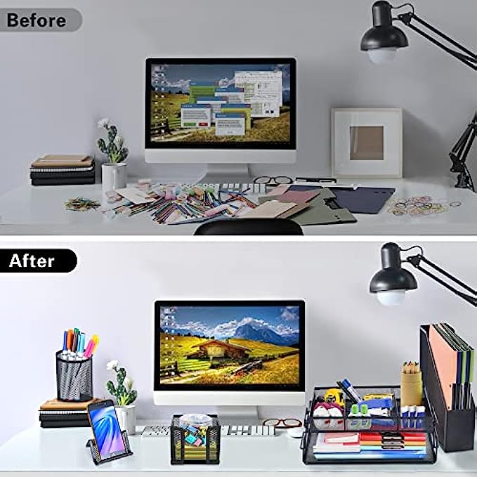 【6 Pieces Desk Organizer Set】- Messy? Get rid of the clutter and expand your mind space. Whether you seek desk organizers for office or home, our desk organizers and accessories - Collecting Tray with 3 Compartments, Paper Tray with handle, Pencil Cup, Sticky Note Holder, Magazine Holder and Business Card Holder can meet your all needs