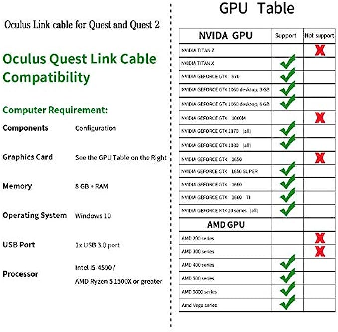 • USB 3.2 GEN 1 : Data transfer rate up to 5Gbps, which allows it connects Quest2 Link Program with no lag. Please make sure to plug it into USB 3.0 slot on the motherboard or GPU to ensure optimal performance.