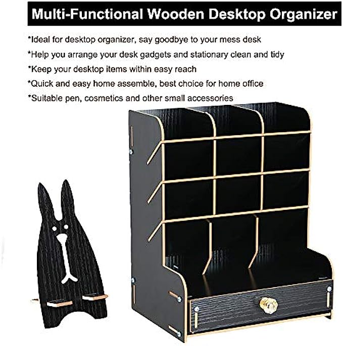 • ✎【CREATIVE DIY DESIGN】: This Desktop organizer needs to be assembled By Yourself, it's full of the joy when you assemble the desktop organizer . Installation according to the instructions or video is very simple ,made up of 15 boards to assemble,fix it with screws. A single man can easily assembly it within 20 minutes. Instantly turn it into an eye-catching stationary.