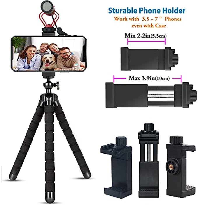 【Upgrated Phone Holder】cell phone tripod holder designed durable constuction, useing a screw stem to open and lock, not a spring clamp that is easily damaged. Cold shoe mount can connect LED light and microphone, for brilliant video recording and vlogging. compatible with 3.5 to 7 inch smartphone