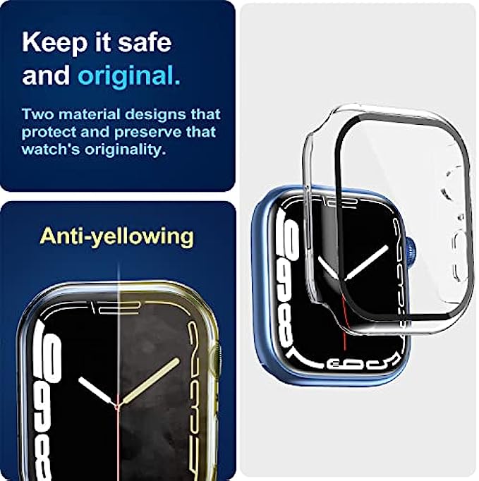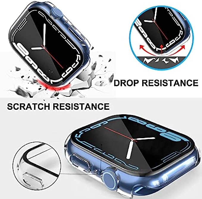 • Slim & Screen Protection: This apple watch series 7 screen protector is made of premium anti-yellowing PC materials, slim and lightweight, and will not add extra bulk to your watch. The 9H hard tempered glass provides 99.99% HD clarity while protecting your screen.