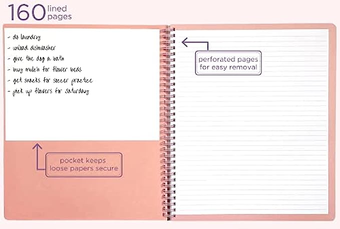 INCLUDES 160 PAGES: Spiral notebook includes 160 high-quality, lined pages that withstand ink bleed-through; pages feature college ruled lines with a perforated edge to easily take to-dos, notes, and reminders on-the-go