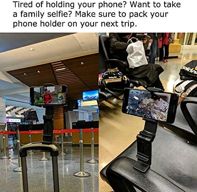 • ✈️ Strong clamp to mount your phone to table, luggage handle, gym equipments or any objects up to 1.5 inch wide.